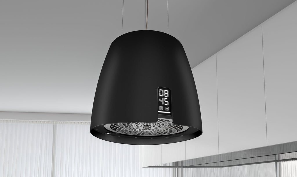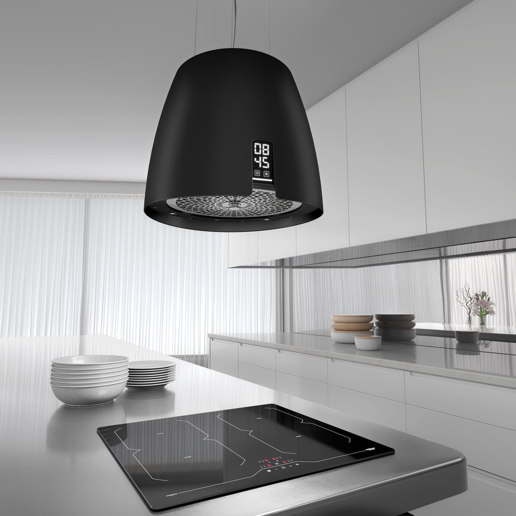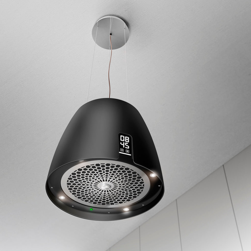Finished in either black or white, the Ballerina is part of the Crisalide filter family from Airforce, with its longer lasting charcoal filter system. This hood also has a built-in touch display with a digital clock as well as two touch buttons for fan speed and light control. The Ballerina can also be used solely as an island lamp with its four 1W LED bulbs.
