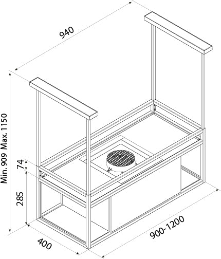 Side shelves in dark glass and upper support surface