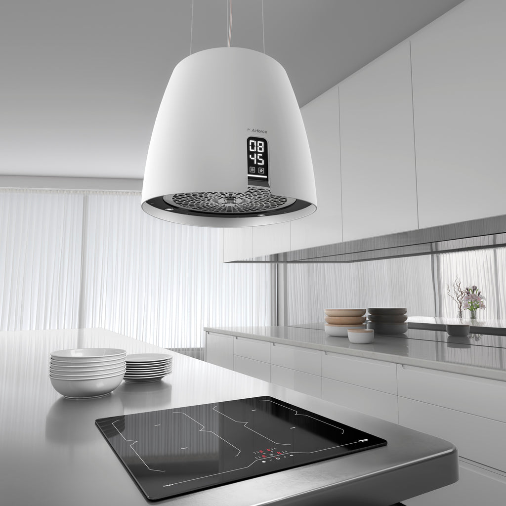 Finished in either black or white, the Ballerina is part of the Crisalide filter family from Airforce, with its longer lasting charcoal filter system. This hood also has a built-in touch display with a digital clock as well as two touch buttons for fan speed and light control. The Ballerina can also be used solely as an island lamp with its four 1W LED bulbs.